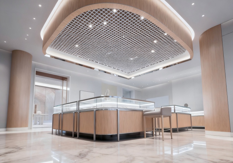 Combining ribbed wood panels, metallic accents and grid ceiling details to create a warm, refined space for daily light luxury jewelry and minimalist designer pieces: