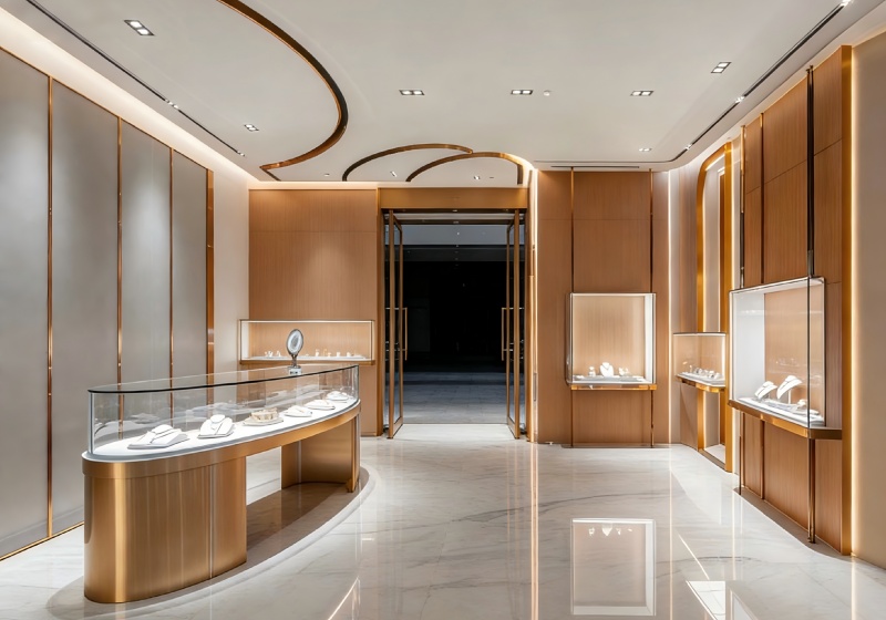 The layout features curved perimeter counters + wall-mounted display niches + symmetrical circulation paths, balancing jewelry visibility and luxurious browsing experience.