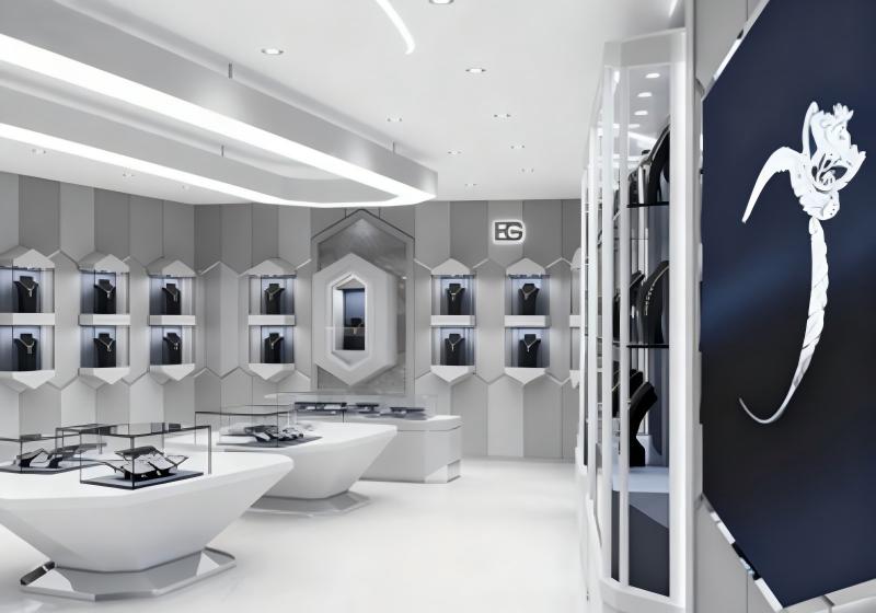 Brand Image: Matte white + polished silver geometric accents + dark displays for a cutting-edge look.