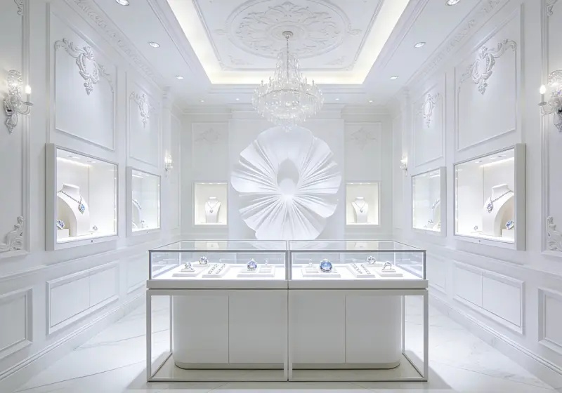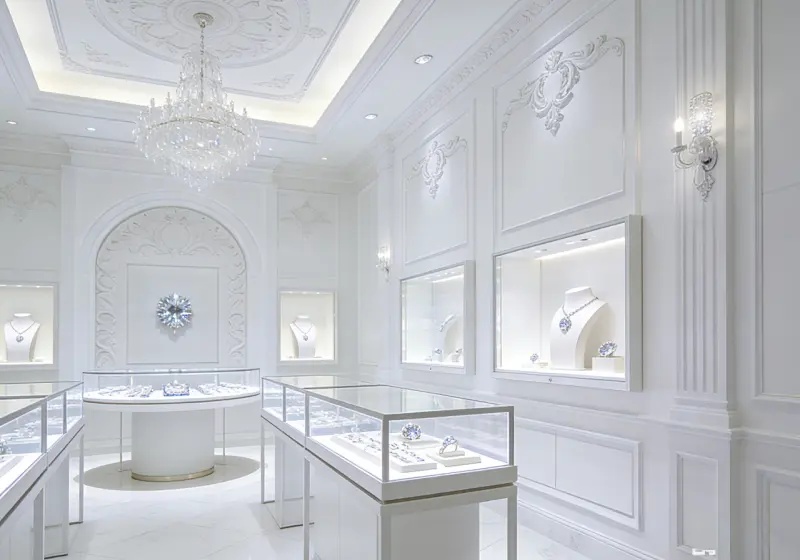 If you’re pursuing a high-end jewelry store with elegant European classical charm, this all-white luxury design will highlight your pieces with timeless grace: