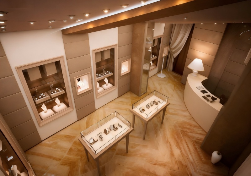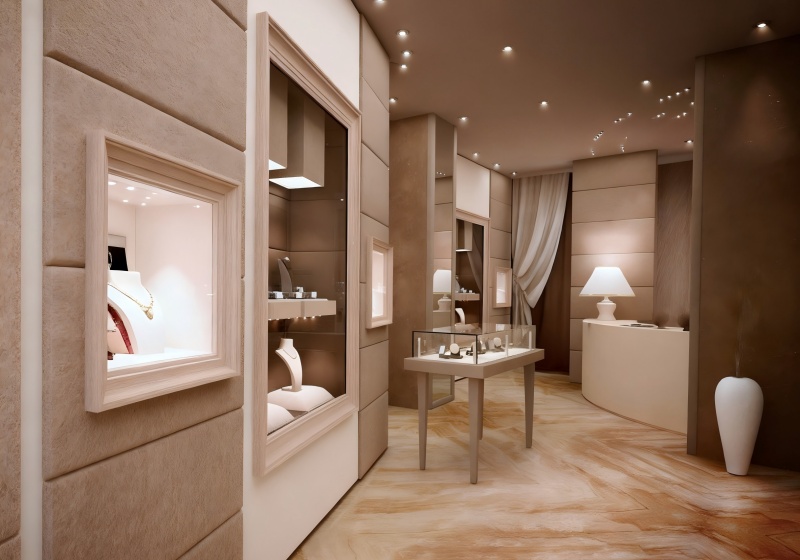 Use transparent glass showcases with light wood frames to highlight jewelry’s delicacy against the taupe & cream cozy backdrop.