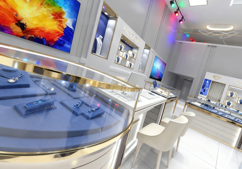 This jewelry store adopts a modern luxury tech style, combining circular central showcases, spiral staircases and embedded lighting to create a high-end futuristic space for premium jewelry: