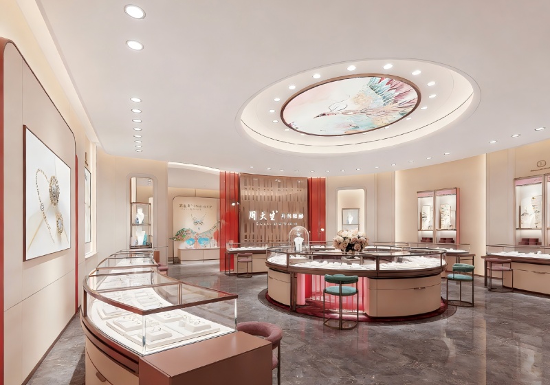 Combining painted dome ceilings, lattice screens and circular showcases to create an elegant, culturally rich space for Chinese-chic gold jewelry, wedding pieces and emotional light luxury accessories: