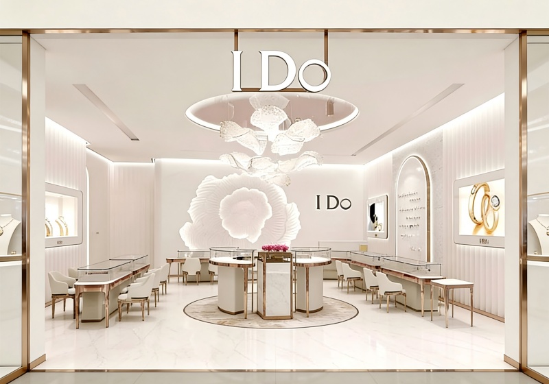 Combining petal art installations, cloud-shaped crystal chandeliers and streamlined showcases to create a soft, dreamy space for wedding rings, couple jewelry and emotional light luxury pieces: