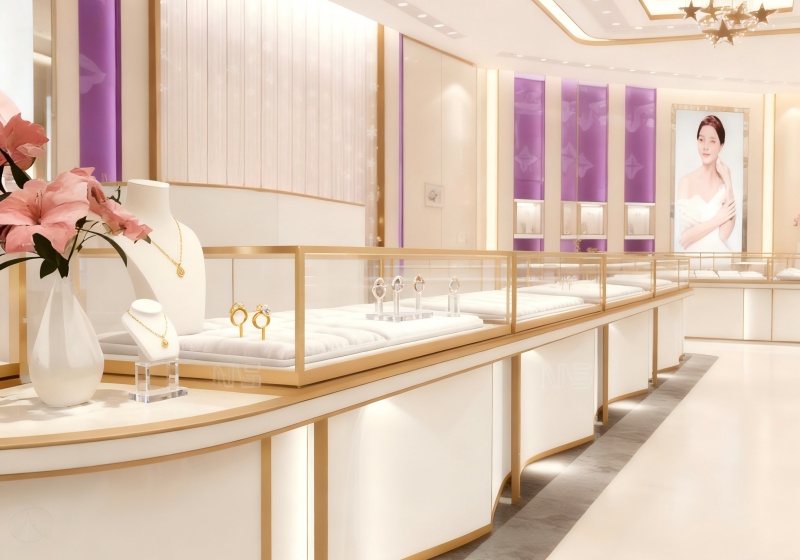 The layout features symmetrical linear counters + curved accent displays + floral art zones, balancing jewelry visibility and a luxurious browsing experience.