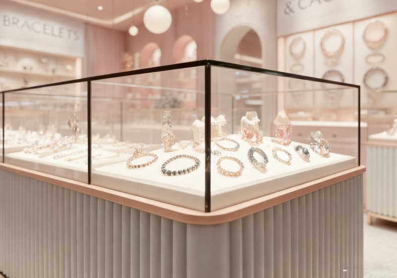 This jewelry store adopts a pastel pink & white light luxury style, focusing on bracelet and charm displays to create a soft, welcoming space for young female customers:
