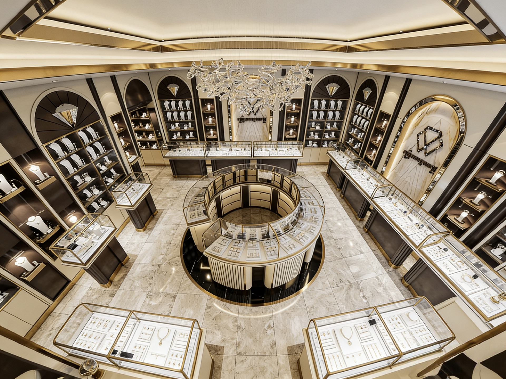 If you’re looking to design a lavish jewelry store with gilded accents, dark wood, and marble elements, we provide expert design strategies to craft a grand and sophisticated retail space: