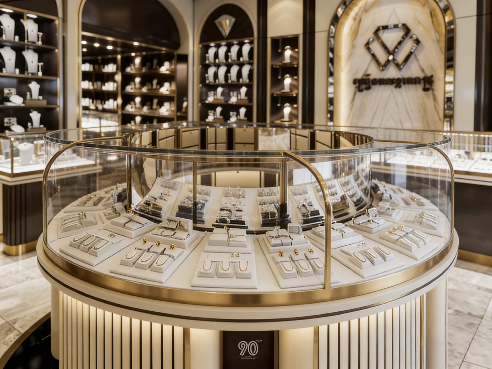 Select custom display fixtures that complement the gilded-marble-dark wood palette and elevate jewelry presentations.