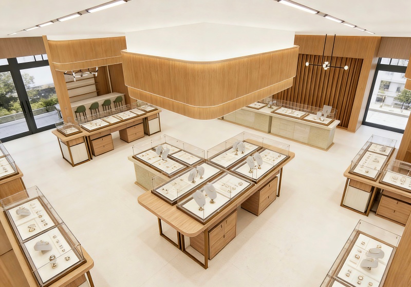 Plan an open spatial layout (with large central display counters) to enhance jewelry accessibility for daily browsing & try-on.