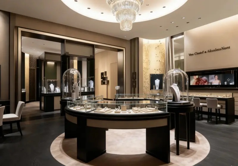 Use luminous glass display cases to highlight jewelry’s luster against the elegant mix of modern and oriental elements.