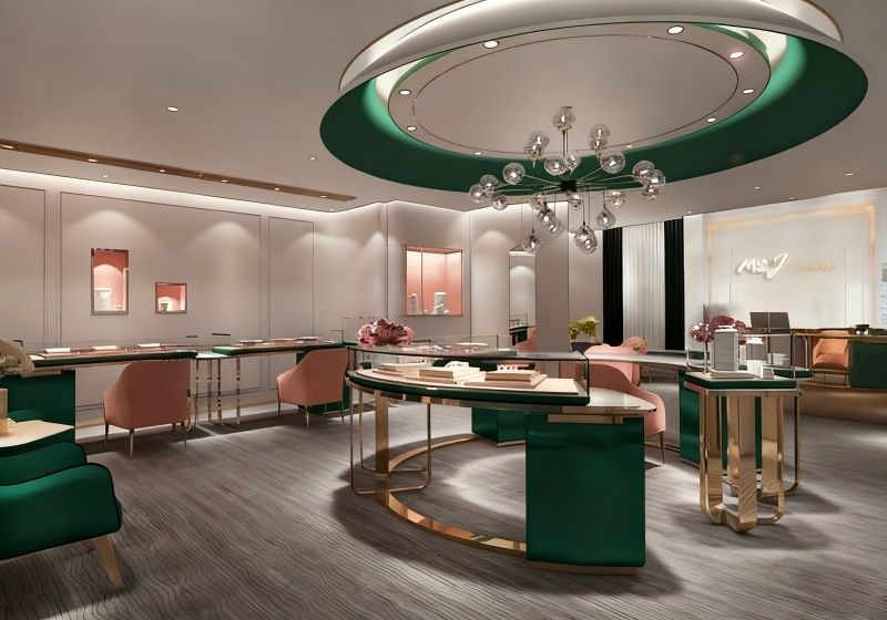 Combining curved luminous ceilings, crystal chandeliers and streamlined showcases to create a romantic, opulent space for retro-style light luxury jewelry: