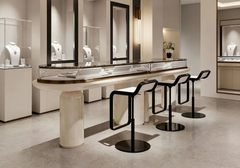 Use minimalist high-transparency display cases to let jewelry become the focal point in the understated space.