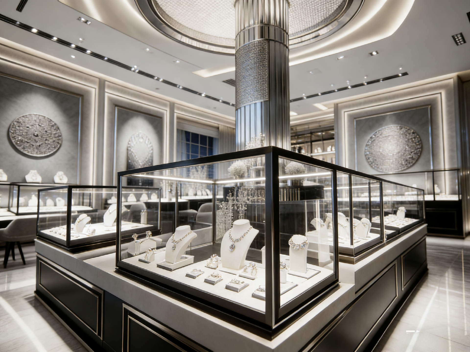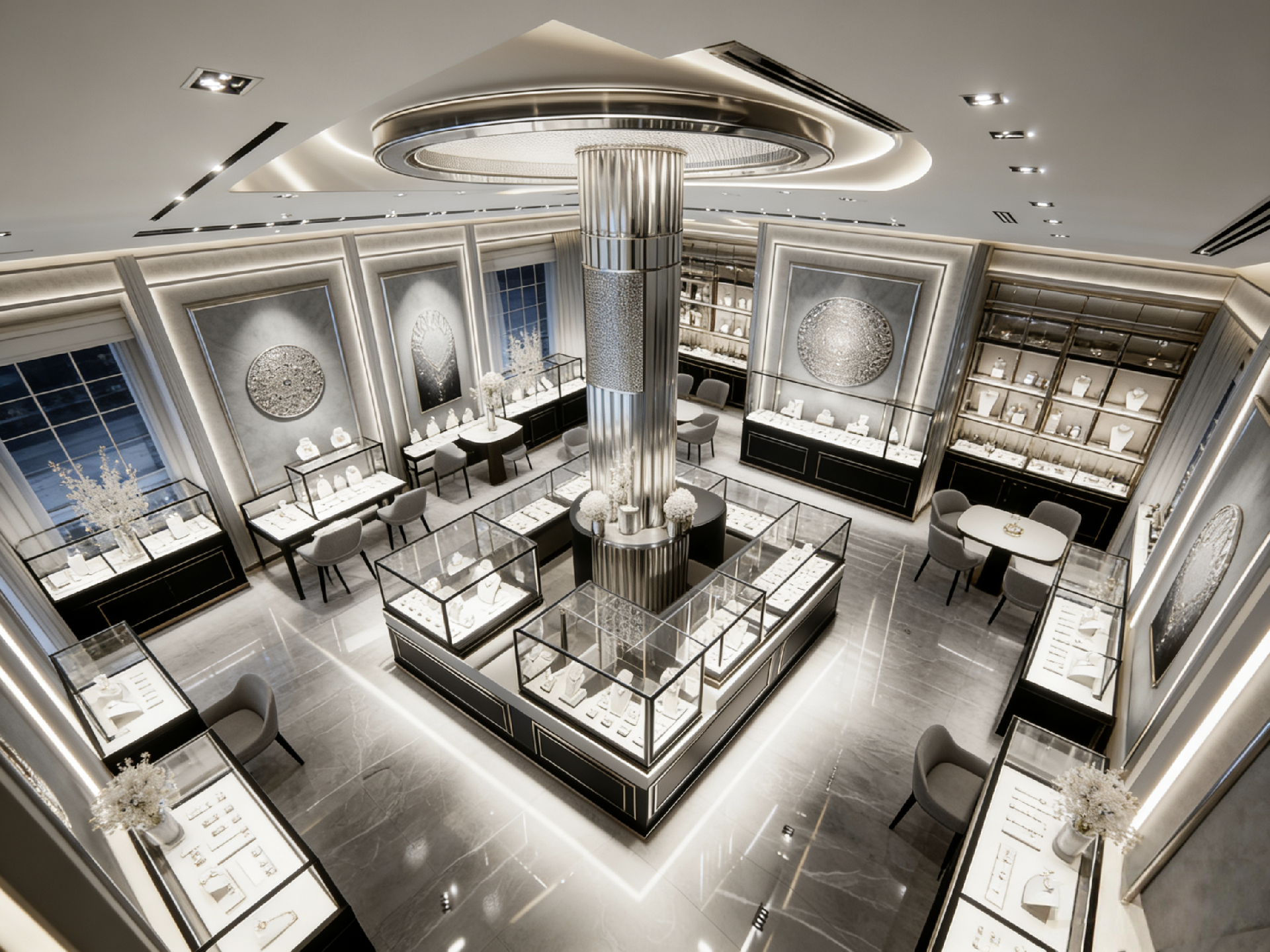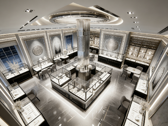 If you want to design a modern luxury jewelry store with silver and black tones, we offer key design insights for a sleek, upscale space: