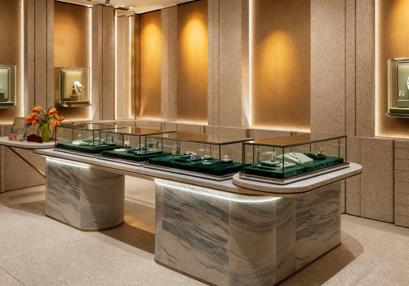 Use transparent glass showcases with gold trims to highlight jewelry’s luster against the beige stone & emerald green backdrop.