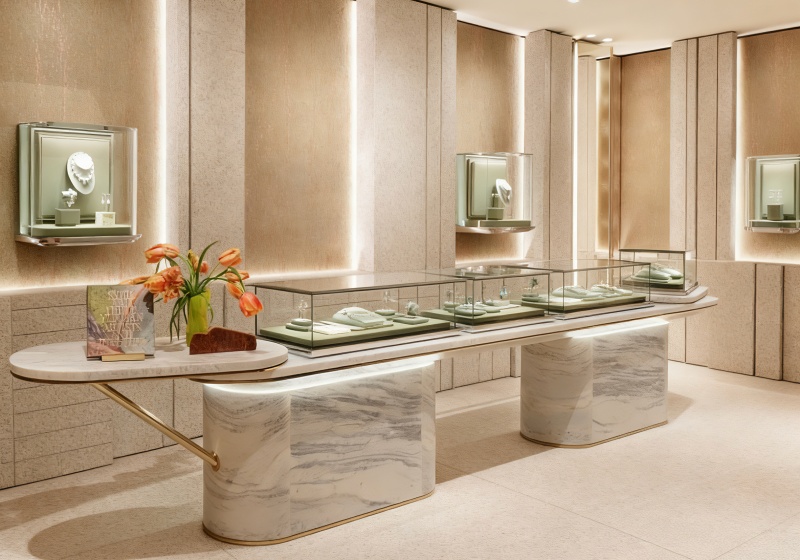 Build a prestigious brand image with light beige stone walls, emerald green velvet linings and gold thin trims.