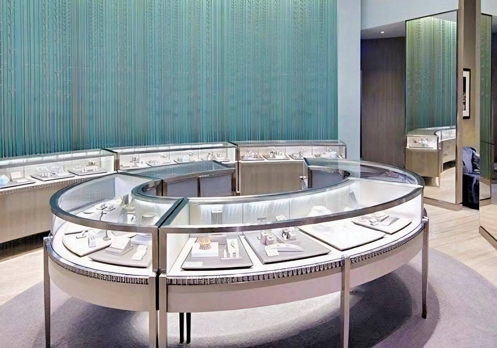 This boutique jewelry space features a signature circular showcase layout placed at the visual center of the store. The flowing arc design naturally guides customers through the space, encouraging relaxed movement and intuitive viewing from every angle.