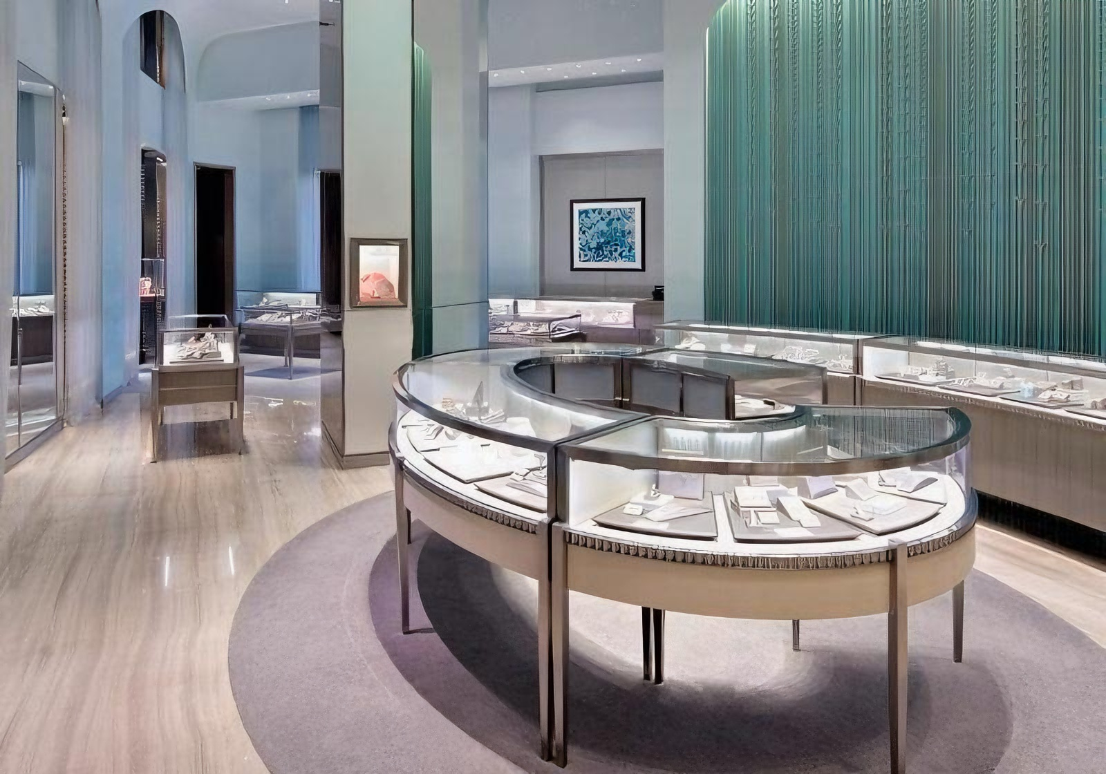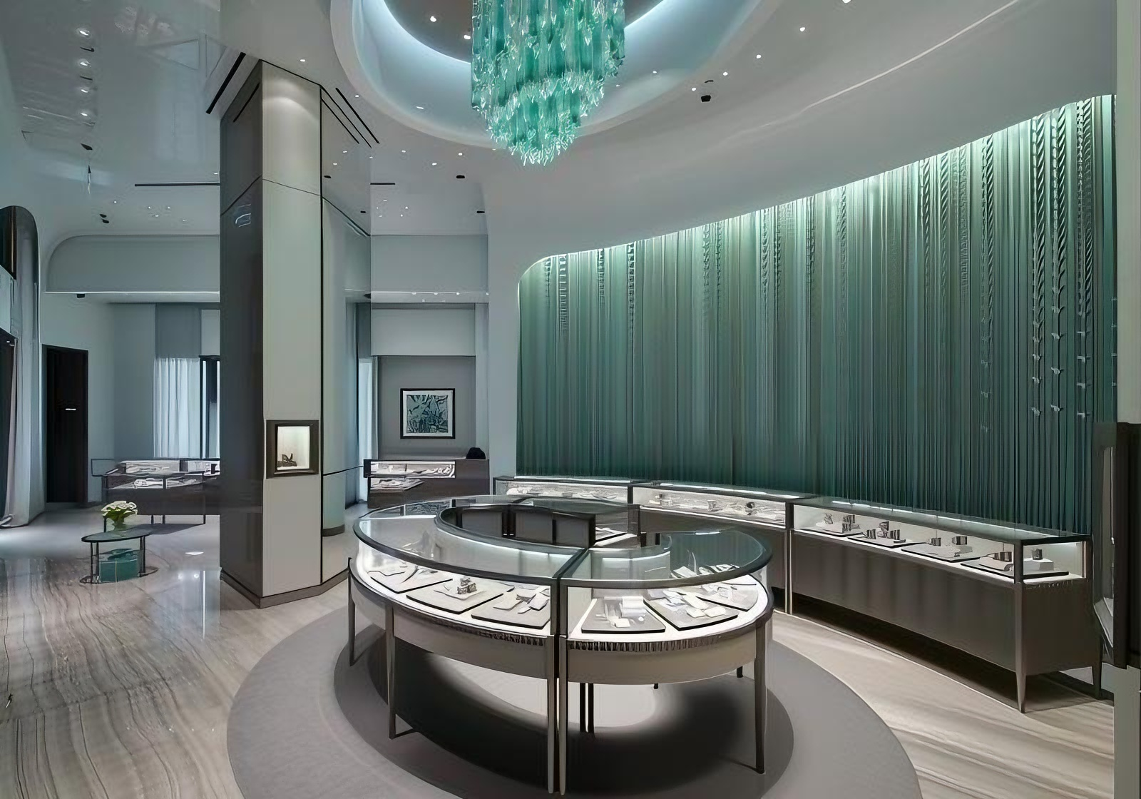 Soft layered lighting — combining ceiling illumination with showcase accent lighting — enhances the brilliance of each piece while maintaining a calm, gallery-like atmosphere. The mint-green textured wall and chandelier add a refined contemporary character, making the store feel luxurious without being overwhelming.