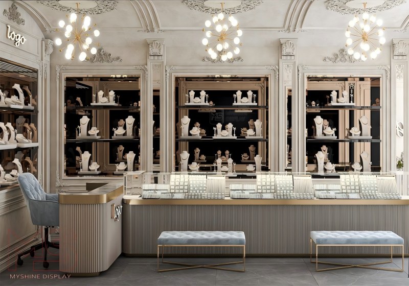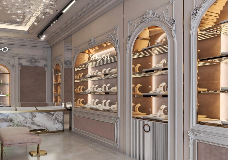 Transform your store into a high-end jewelry boutique with our European-inspired arched wall display system. Every detail—from the carved moldings to the soft backlit shelves—is crafted to highlight your jewelry in the most luxurious way.