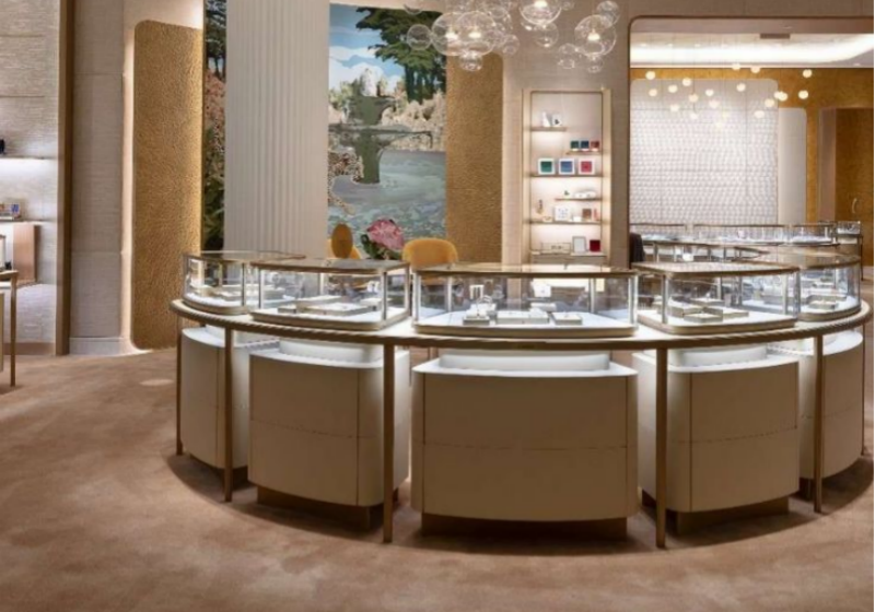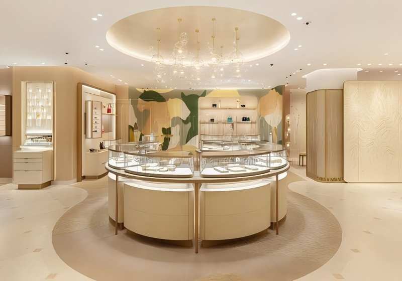 This modern luxury jewelry store interior design combines premium craftsmanship with immersive retail experience. The space features curved glass display counters, refined gold accents, soft ambient lighting, and a clean blue-and-white palette to create an elegant and calming shopping environment. Designed for luxury brands, museums, and premium retail spaces, this concept delivers not only aesthetics, but also functionality, durability, and brand identity.