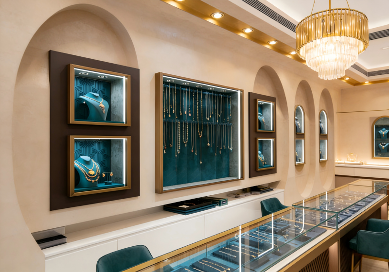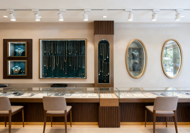 The jewelry store display system by MS Display Ltd. combines sleek, modern design with functional retail elements. Featuring soft lighting, high-quality materials such as tempered glass and brass accents, and a clean, minimalist aesthetic, this design showcases your jewelry while maintaining a sense of luxury and sophistication. The space is carefully curated to enhance the customer experience, offering a refined environment that perfectly balances style and practicality. Ideal for upscale boutiques, this system is both visually stunning and operationally efficient.