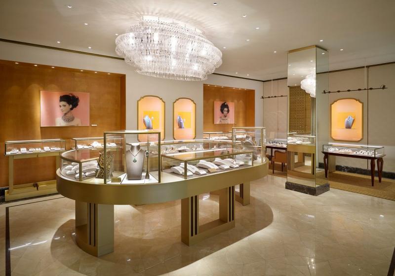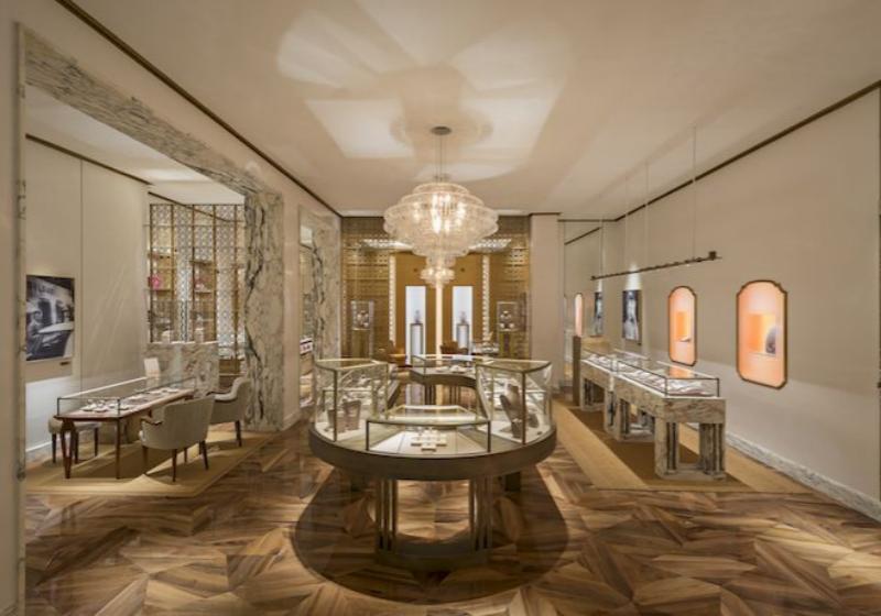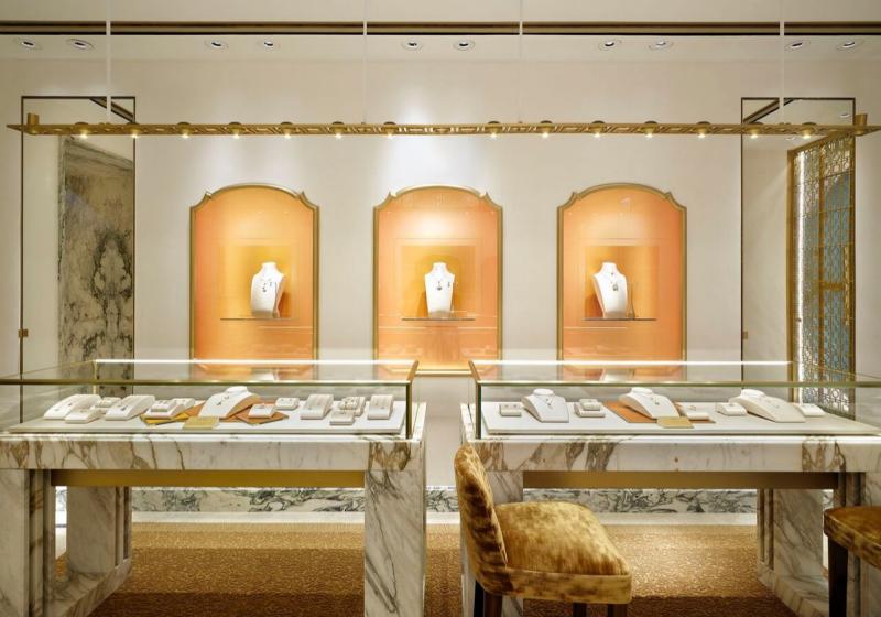 The consistent use of marble across floors, walls, and showcases delivers a sense of permanence and timeless value, perfectly echoing the essence of fine jewelry — rarity, strength, and elegance.