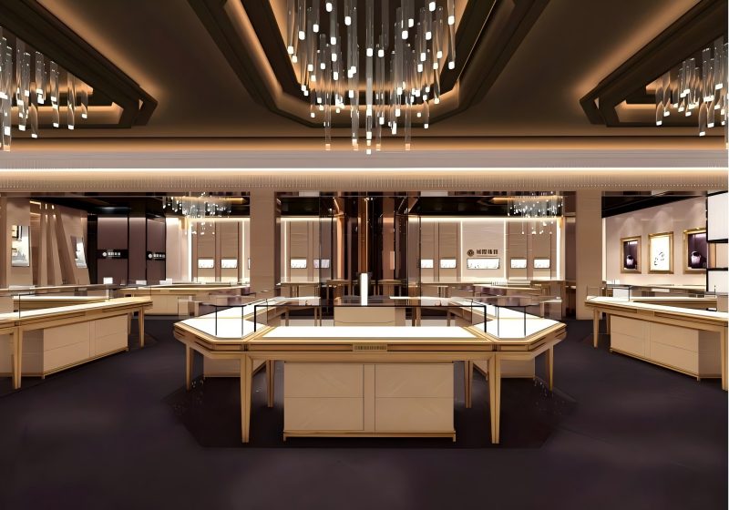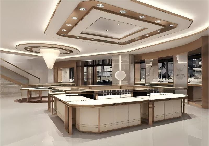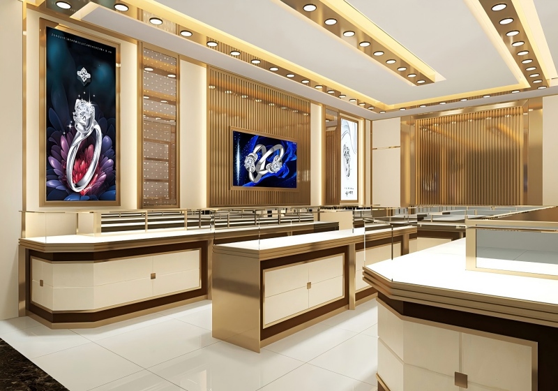 MS DISPLAY LTD specializes in building full-store display solutions that elevate your retail space. This design features warm champagne-gold tones, glossy finishes, and open layouts that make your store feel spacious and elegant. The showcases, wall cabinets, and lighting work together to create a professional, luxury shopping experience that highlights every piece you display. Whether you're opening a new store or upgrading your current one, this system gives your brand a refined, modern identity.