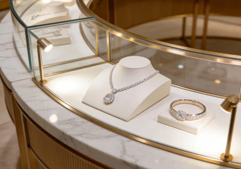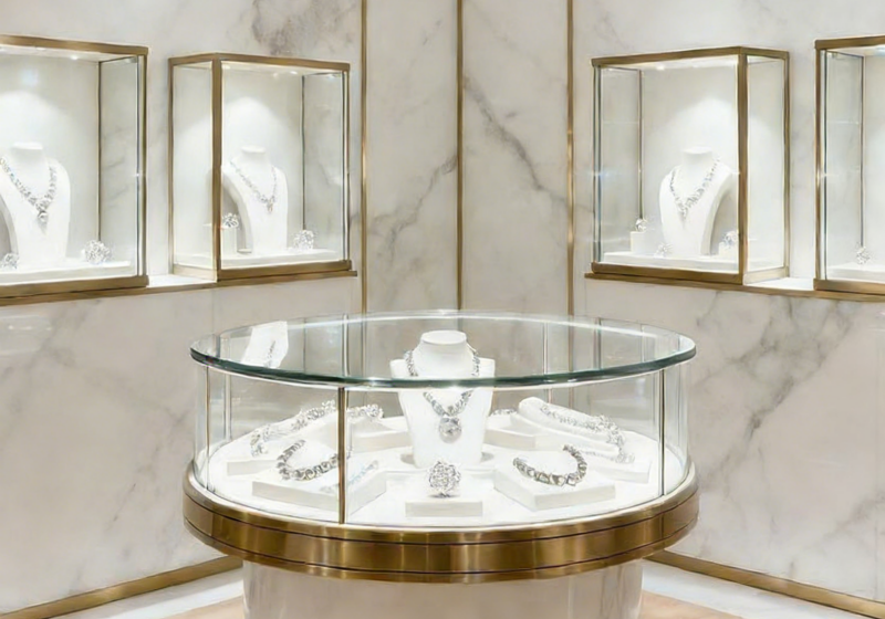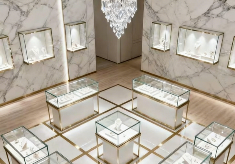 The clean geometric lines, soft lighting, and central chandelier highlight the jewelry like art in a gallery — delivering an immersive, high-end shopping experience designed for premium brands and VIP retail spaces.