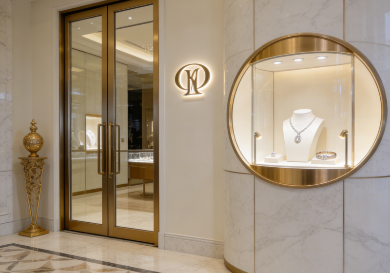 This luxury jewelry store concept blends Italian-style marble finishes with champagne-gold detailing, creating a refined and timeless retail environment.