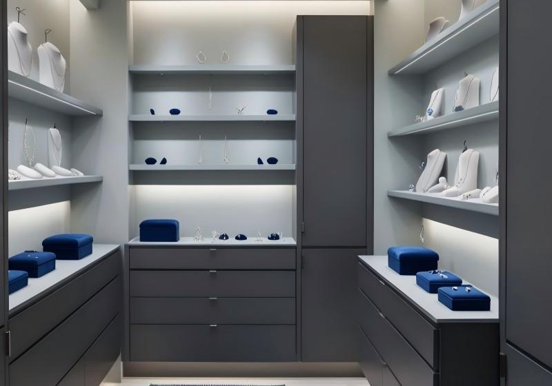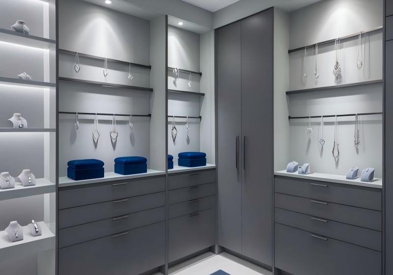 The core design philosophy is “less is more”. The monochromatic gray palette, soft integrated lighting, and open shelving eliminate distractions, directing all attention to the jewelry itself. The symmetrical layout feels balanced and calm, creating an atmosphere that feels more like a private collection room than a busy retail store.