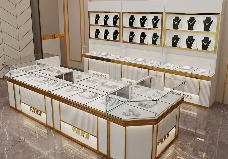 The tempered glass showcases allow customers to view jewelry clearly from multiple angles. This open yet secure structure encourages engagement while maintaining a premium retail atmosphere.