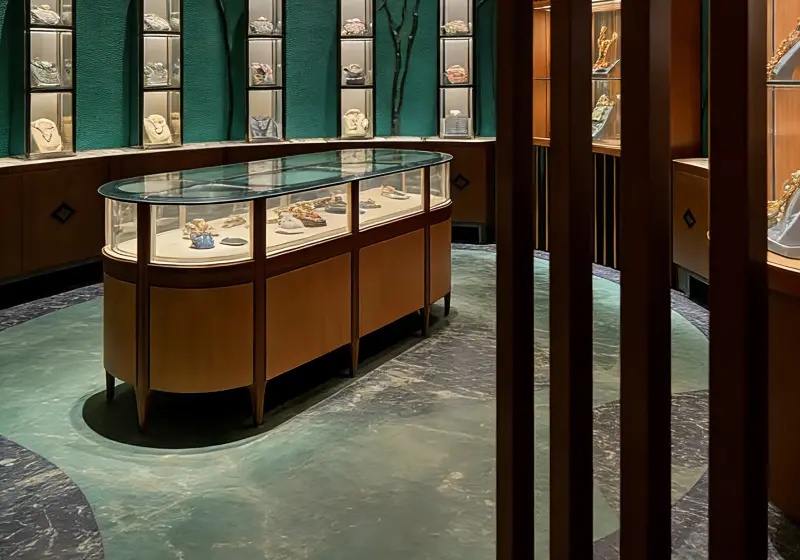 This elegant semi-circular jewelry display counter features a curved all-glass enclosure for 360° viewing, a premium walnut-finished wooden frame and base with sleek tapered legs, a soft cream velvet interior lining to highlight jewelry, and integrated warm LED spotlights, perfectly suited for high-end retail environments to showcase luxury pieces in a sophisticated, luxurious setting.