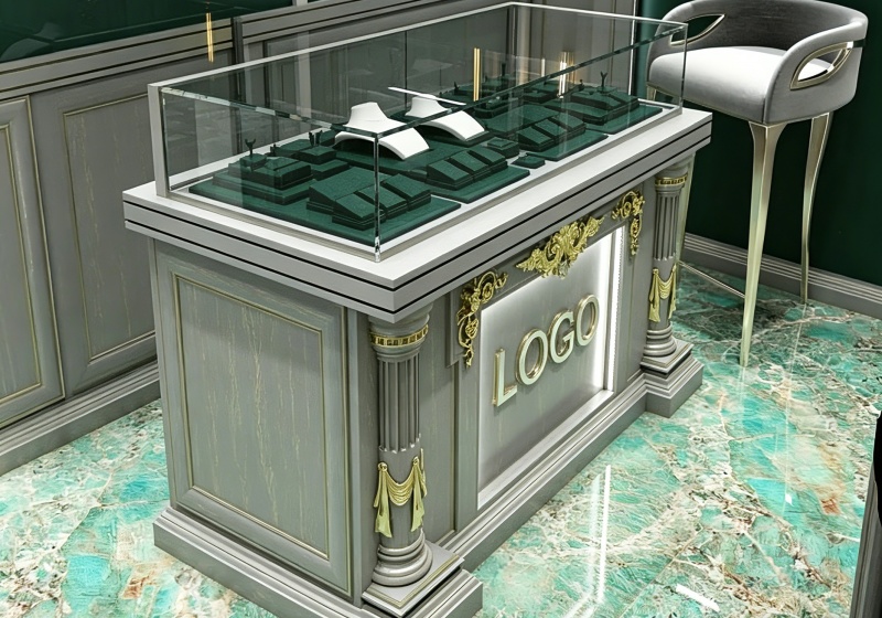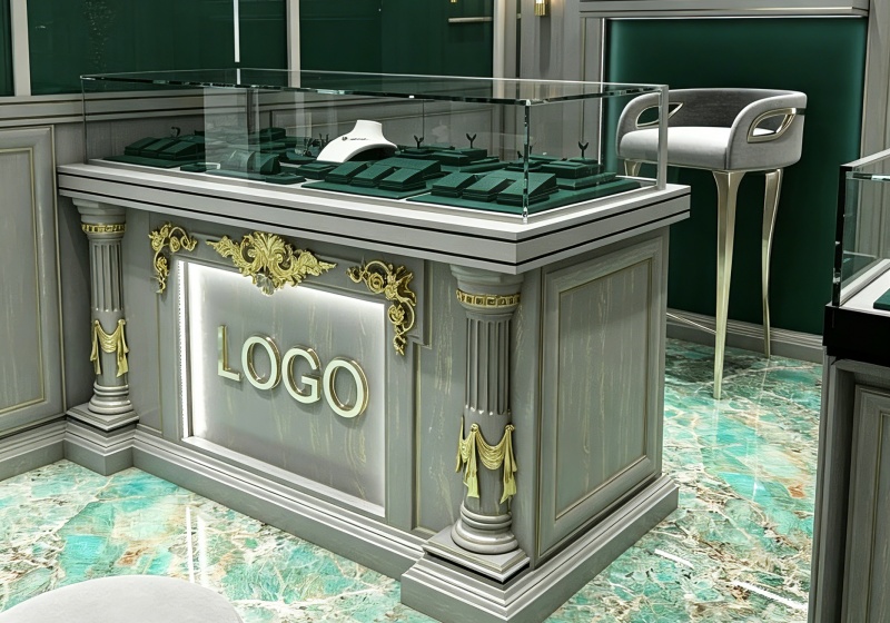 This luxury jewelry display cabinet reimagines timeless European opulence for high-end boutiques, featuring an elegant silver-toned frame adorned with intricate gold-leaf carvings and classical column accents that exude regal sophistication. The crystal-clear tempered glass top offers unobstructed visibility while protecting pieces, paired with rich emerald-green velvet trays designed to showcase rings, necklaces, and bracelets with striking contrast. An illuminated custom logo panel adds a bespoke brand touch, blending exquisite craftsmanship, premium materials, and functional design to elevate the presentation of fine jewelry.